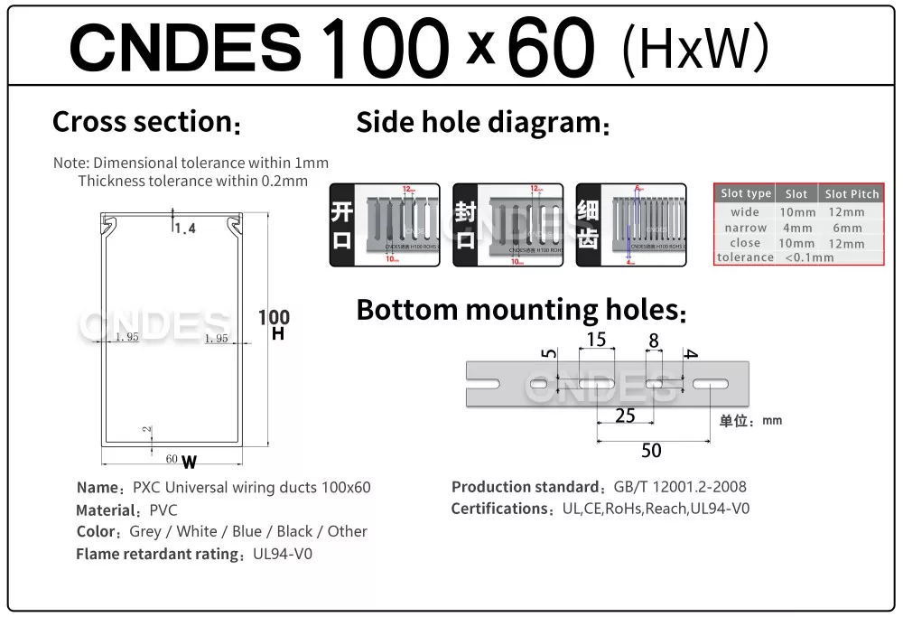 Прецизійні канавки – прецизійні канавки – якісні канали з ПВХ 100 × 60 для електричних панелей мають однорідний дизайн канавок, що дозволяє кабелям виходити з будь-якого місця; індивідуальні шаблони отворів доступні як опція..