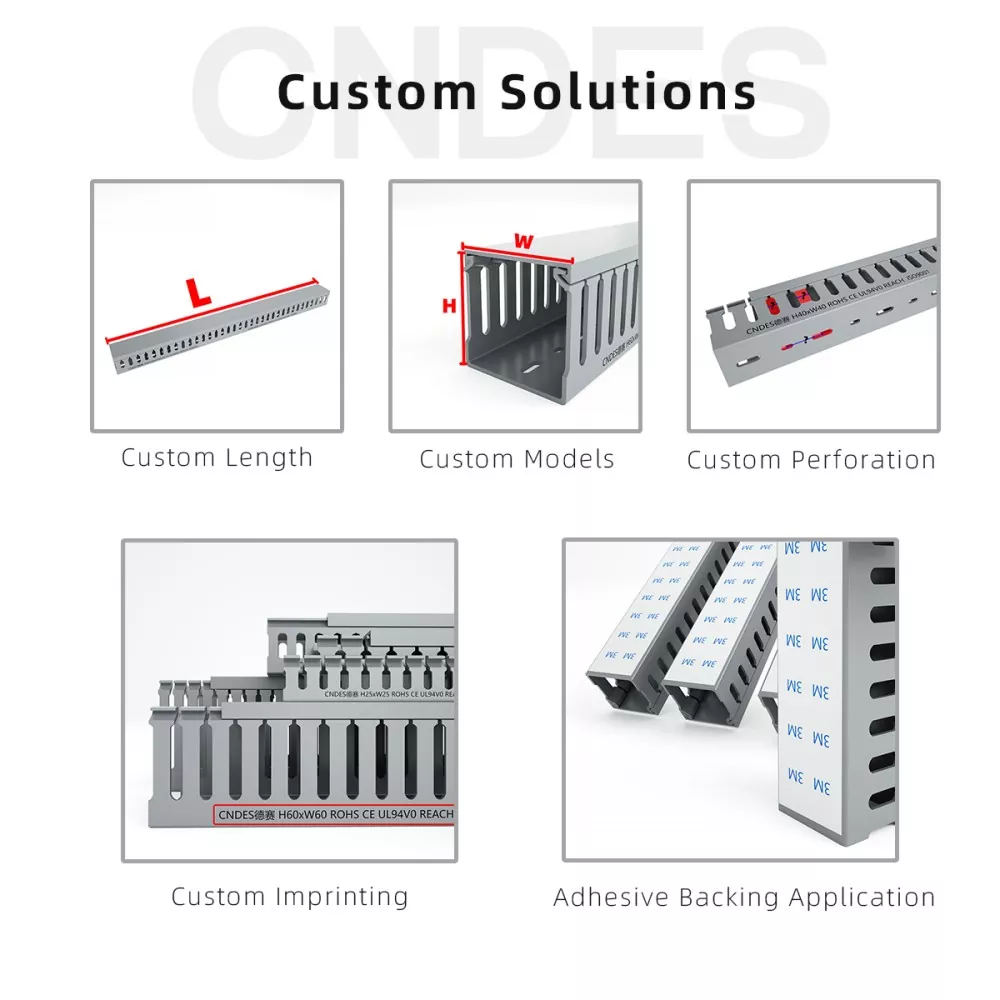 У CNDES ми надаємо всебічне налаштування кабельних каналів. Наші послуги охоплюють спеціалізовані функціональні характеристики (антистатичні, стійкі до ультрафіолетового випромінювання, легкозламні) і повне коригування розмірів (довжина, висота, ширина, положення отвору/профіль/крок) до опцій естетичного брендування (спеціальні кольори, логотип, друк тексту). Ми також пропонуємо клейову основу.